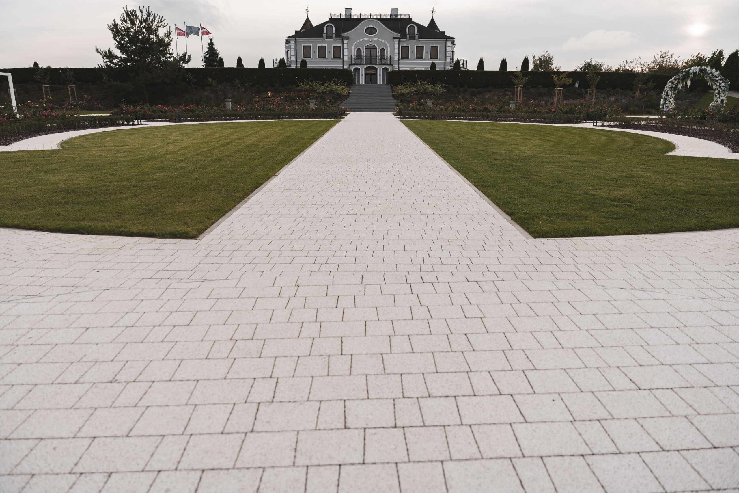 Akmens tekstūrų elegancija Svētku pils kraštovaizdyje. Tai vieta, kur kuriamos nepamirštamos akimirkos, todėl dangos turi atitikti pastato statusą – jos turi būti elegantiškos ir patvarios. Šiame projekte mūsų užduotis buvo pateikti sprendimą, kuris harmoningai papildytų rūmų architektūrą ir atlaikytų intensyvų lankytojų srautą. Sprendimas: NORD 6 SET su natūralia Carrara akmens tekstūra.