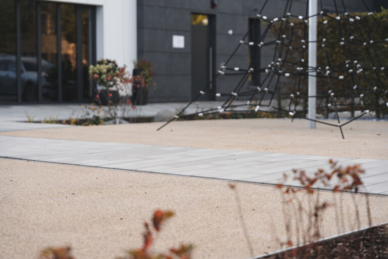K9 Padel Club teritorijoje sukurta stabili ir estetiškai patraukli danga, kuri harmoningai dera su sporto komplekso dinamiška atmosfera. Šis projektas iliustruoja, kaip švarios formos ir kontrastai gali sukurti minimalistinį ir išraiškingą dizainą.