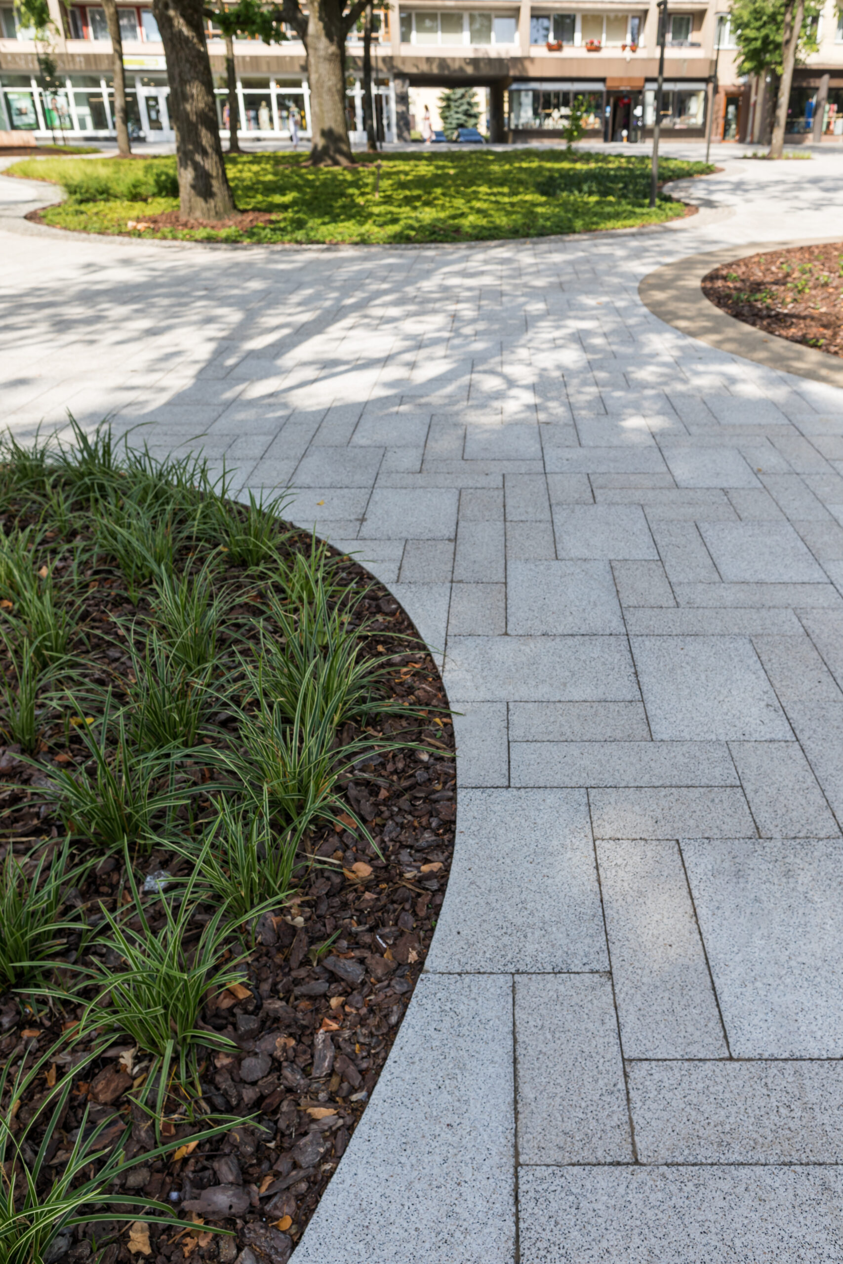Aikštės prieigose suformuota vienodų matmenų gaminio Plaza 6×4 danga, miksuojant Quartz, Silver ir Lava natūralaus akmens faktūras. Išlaikant skirtingą faktūrų kiekį išgautas unikalus, neįkyrus bet ir nenuobodus grindinys. Keliaujant tolyn – lieka tik vienos faktūros, bet skirtingų matmenų gaminiai – Plaza 6×4, Plaza 6×2 ir Plaza 4×2 dengtos natūralaus akmens faktūra Quartz formuoja subalansuotą raštą.