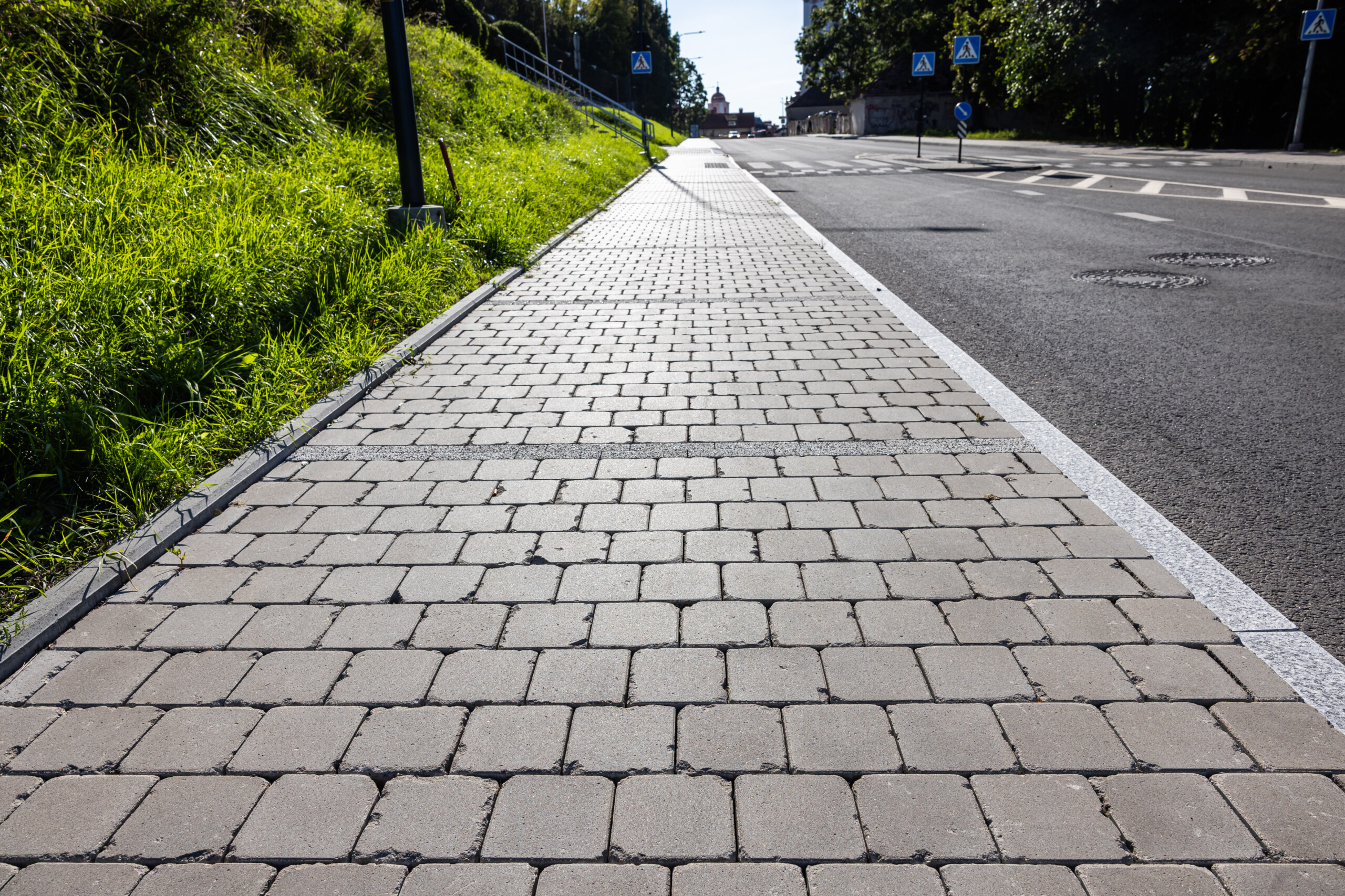 Šaligatviams panaudoti produktai – sendinta natūrali Troja, Silver daugiaspalve dengti Dito 8 gaminiai, taktiliniai gaminiai Prizma 8L ir Prizma 8D.